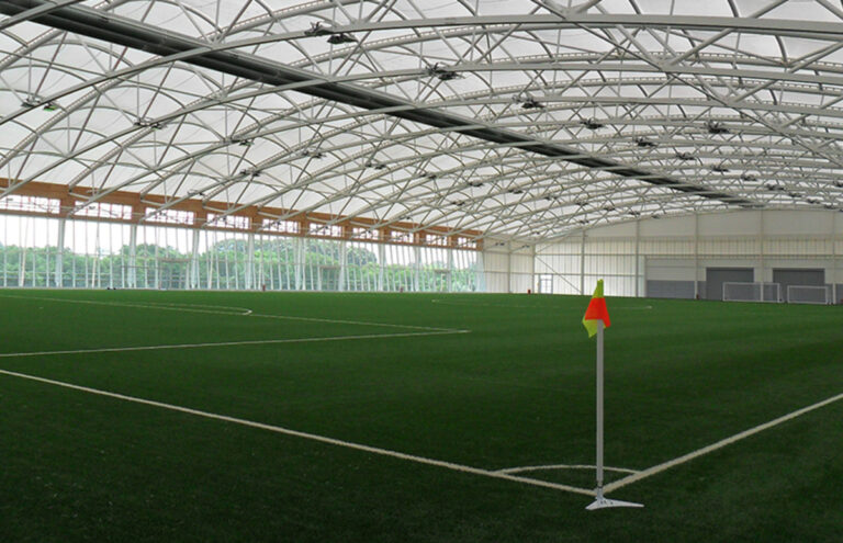 The steel erection was a complex procedure as the design comprised 80m wide spans of large column free space. A series of large 4.5m deep trusses have been erected. The roof of the indoor pitch, supported by the trusses, has been constructed from a PVC material which is held in place by more than 10,000 brackets, welded to the truss sections by Tubecon. The fabric roof disguises the amount of detailed work that has been necessary to achieve the overall look.
